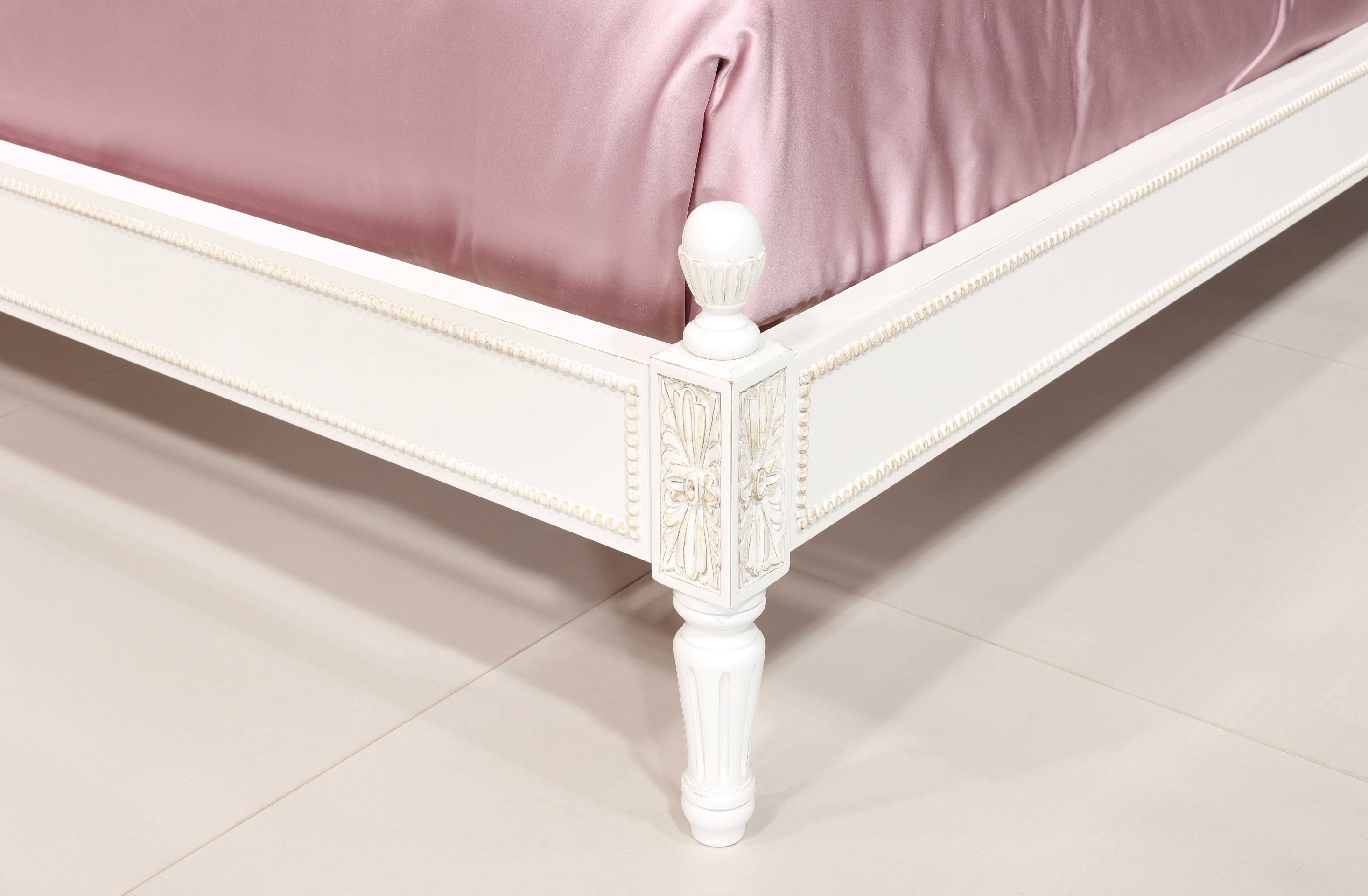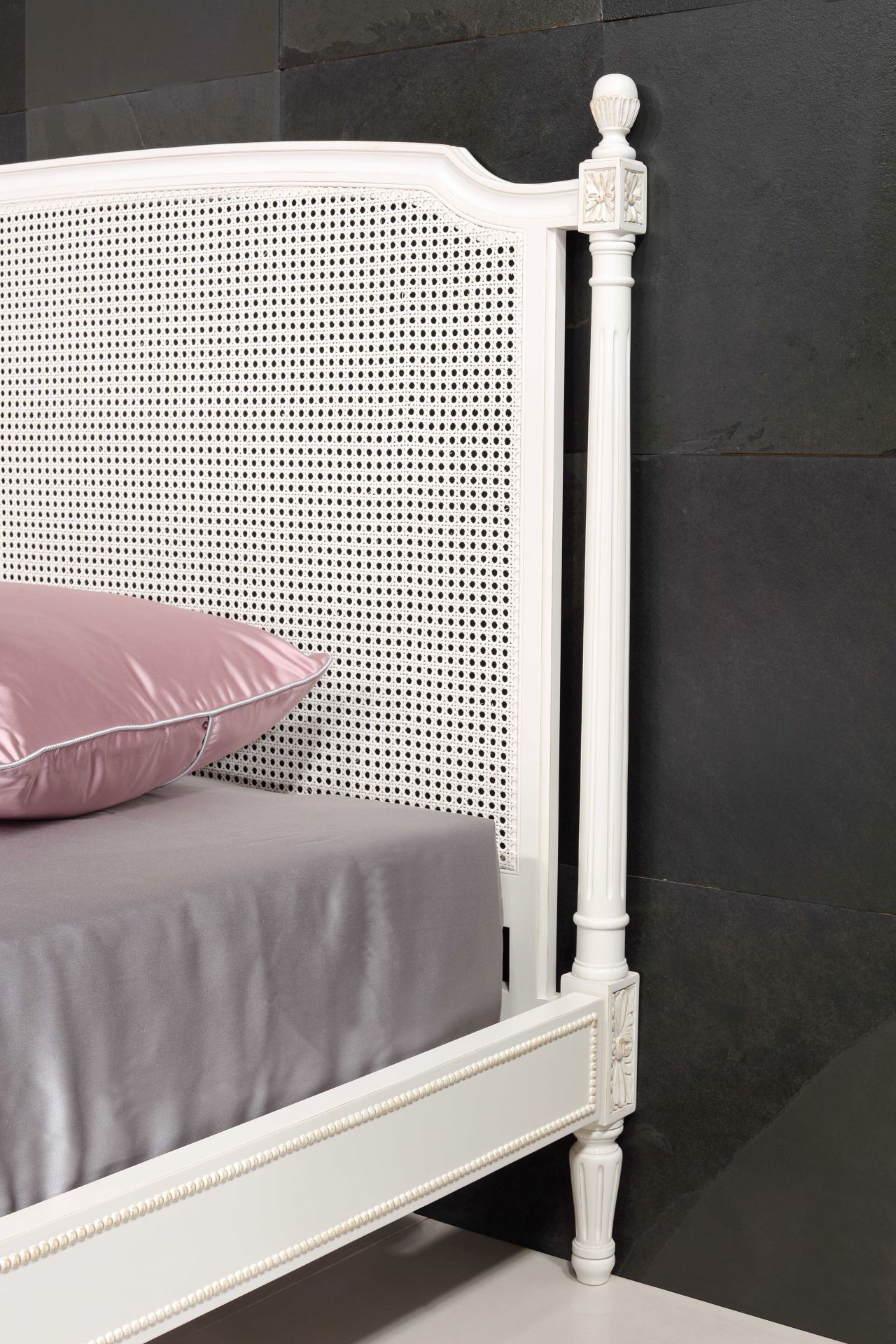 Lit Louis XVI en Merisier Massif – 180x200 cm Design : Inspiré du style Louis XVI, raffiné et intemporel Structure : Réalisé en merisier massif, gage de robustesse et de noblesse Tête de lit : Cannée, apportant légèreté et élégance au mobilier Finition : Teinte ivoire patiné, travaillée à la main pour un rendu authentique et chaleureux Fabrication : Traditionnelle, respectant le savoir‑faire artisanal Dimensions literie : 180 x 200 cm Précision : Les tables de nuit visibles sur certaines photos ne sont pas incluses