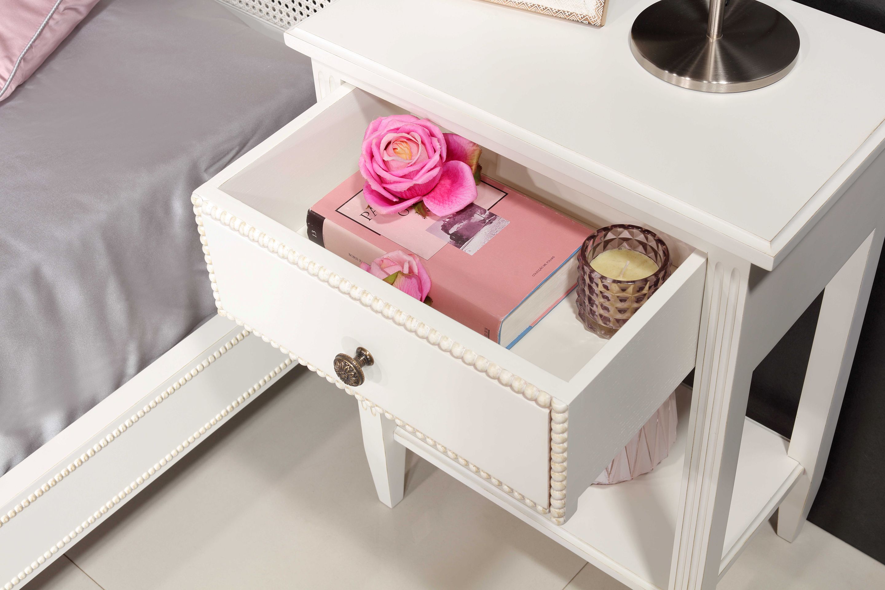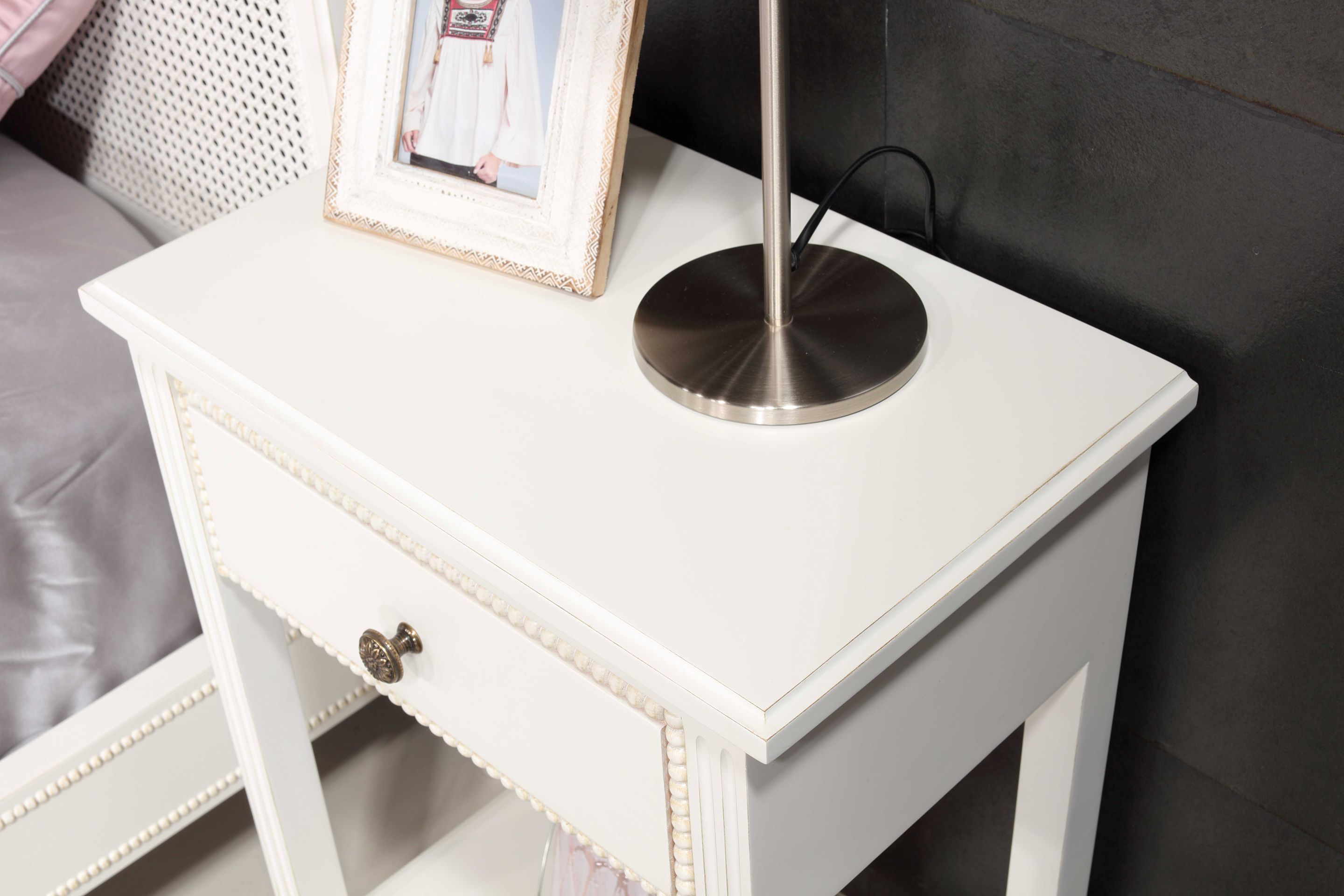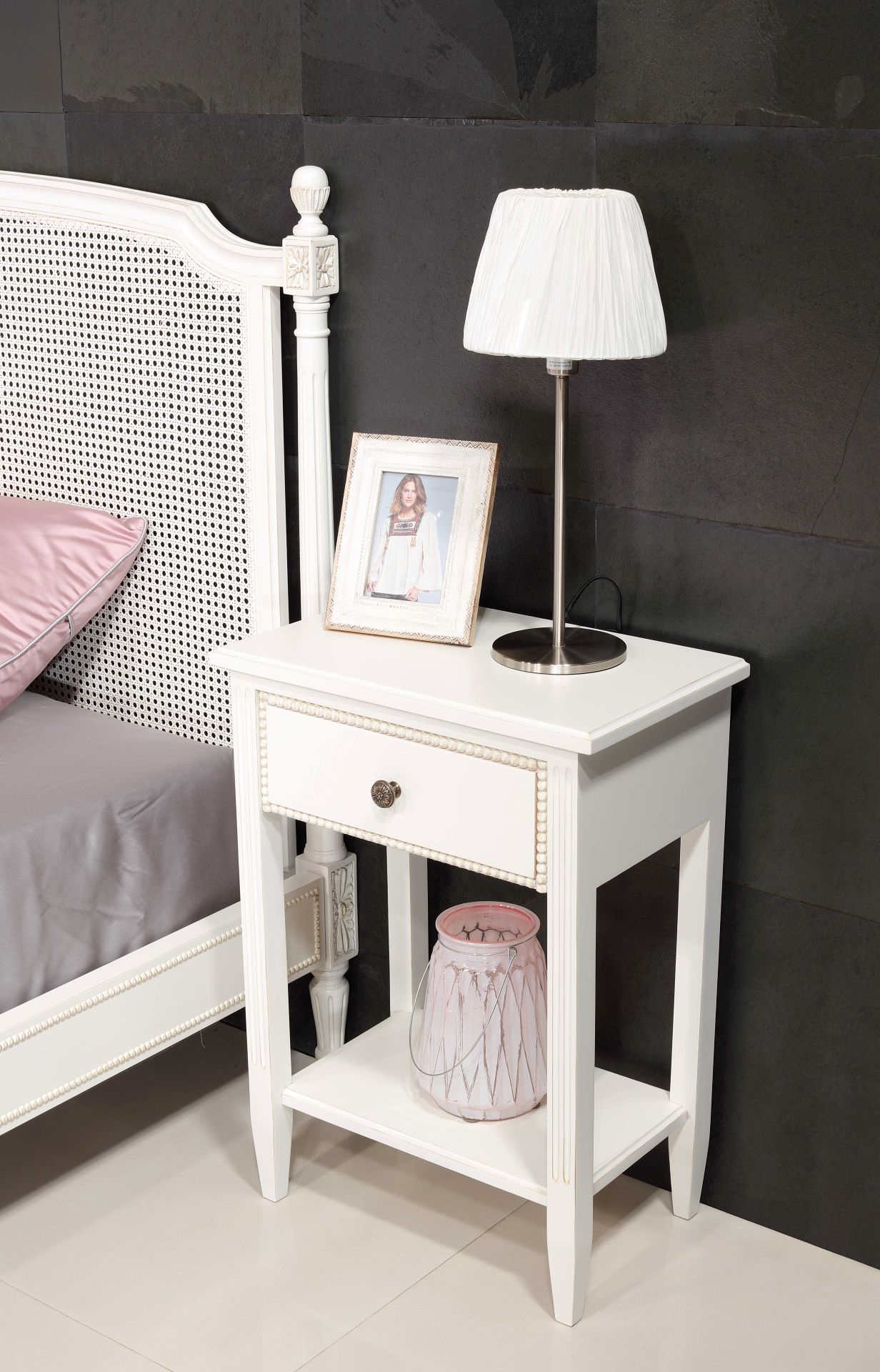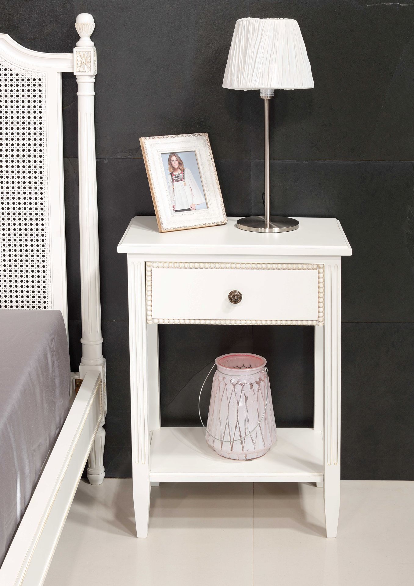 Table de nuit de style Louis XVI en Merisier Massif, Style : Louis XVI, raffiné et intemporel Matière : Merisier massif, gage de solidité et d’élégance Agencement : 1 tiroir pratique + 1 tablette fonctionnelle Finition : Ivoire n°2 légèrement patiné, Fabrication : Traditionnelle, respectant le savoir‑faire artisanal Service : Échantillons gratuits disponibles sur demande,