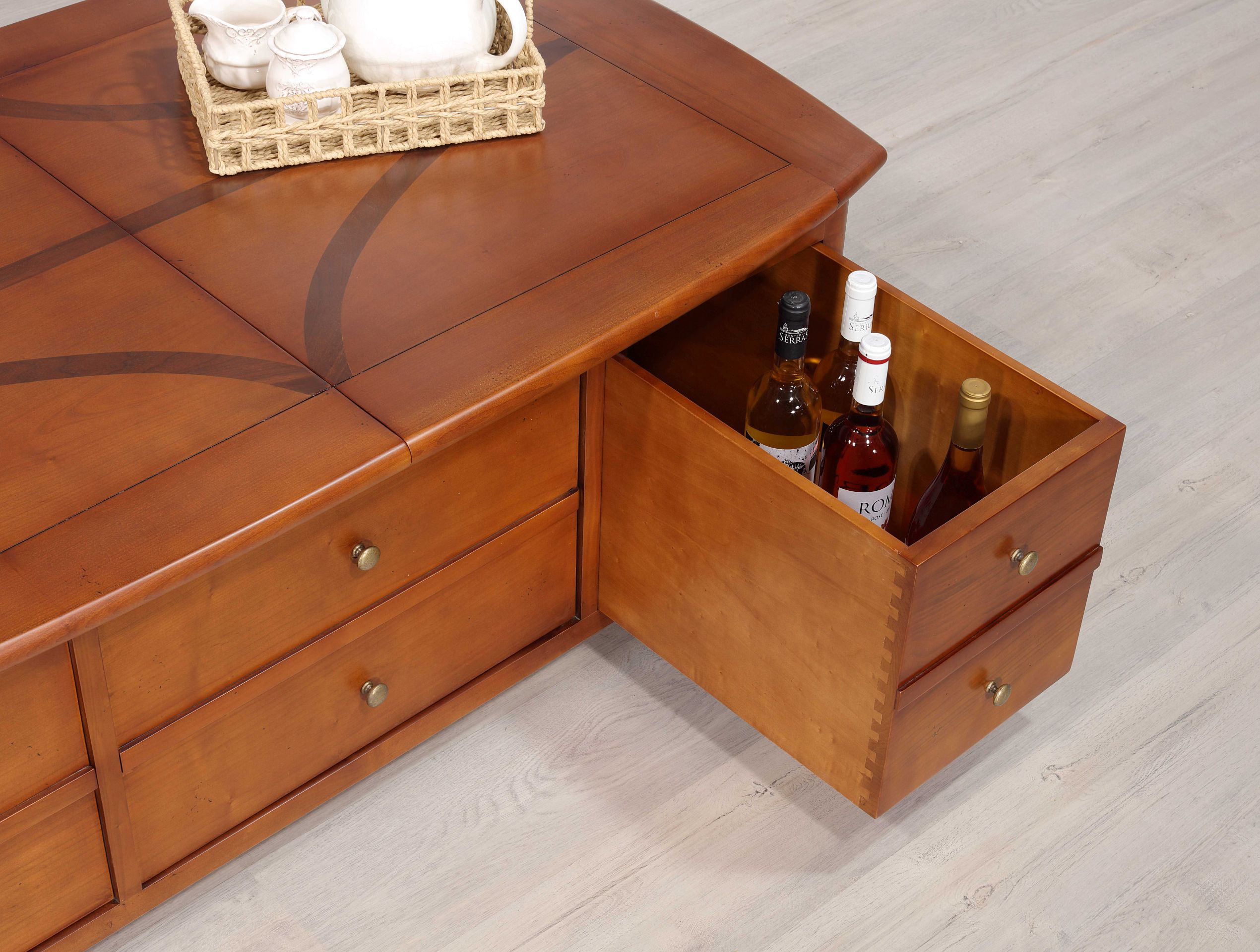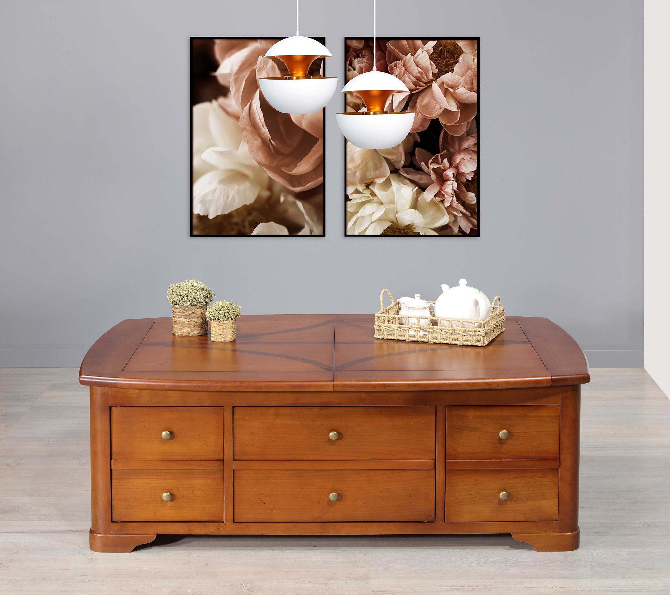Table basse rectangulaire légèrement ovalisée réalisée en merisier de style Louis Philippe. Apportez élégance et praticité à votre intérieur avec cette table basse, Plateau rectangulaire avec une superbe marqueterie, gage de savoir-faire artisanal. Finition merisier doré, sublimée par une légère patine antiquaire pour un charme intemporel. 1 allonge* discrètement rangée sous le plateau : la table atteint 175 x 80 cm une fois déployée. 1 tiroir en va-et-vient, idéal pour ranger vos bouteilles. 2 portes ouvrant des deux côtés, pour un accès pratique et convivial. - Entretien facile Un simple chiffon doux suffit pour préserver son éclat et sa beauté au quotidien.