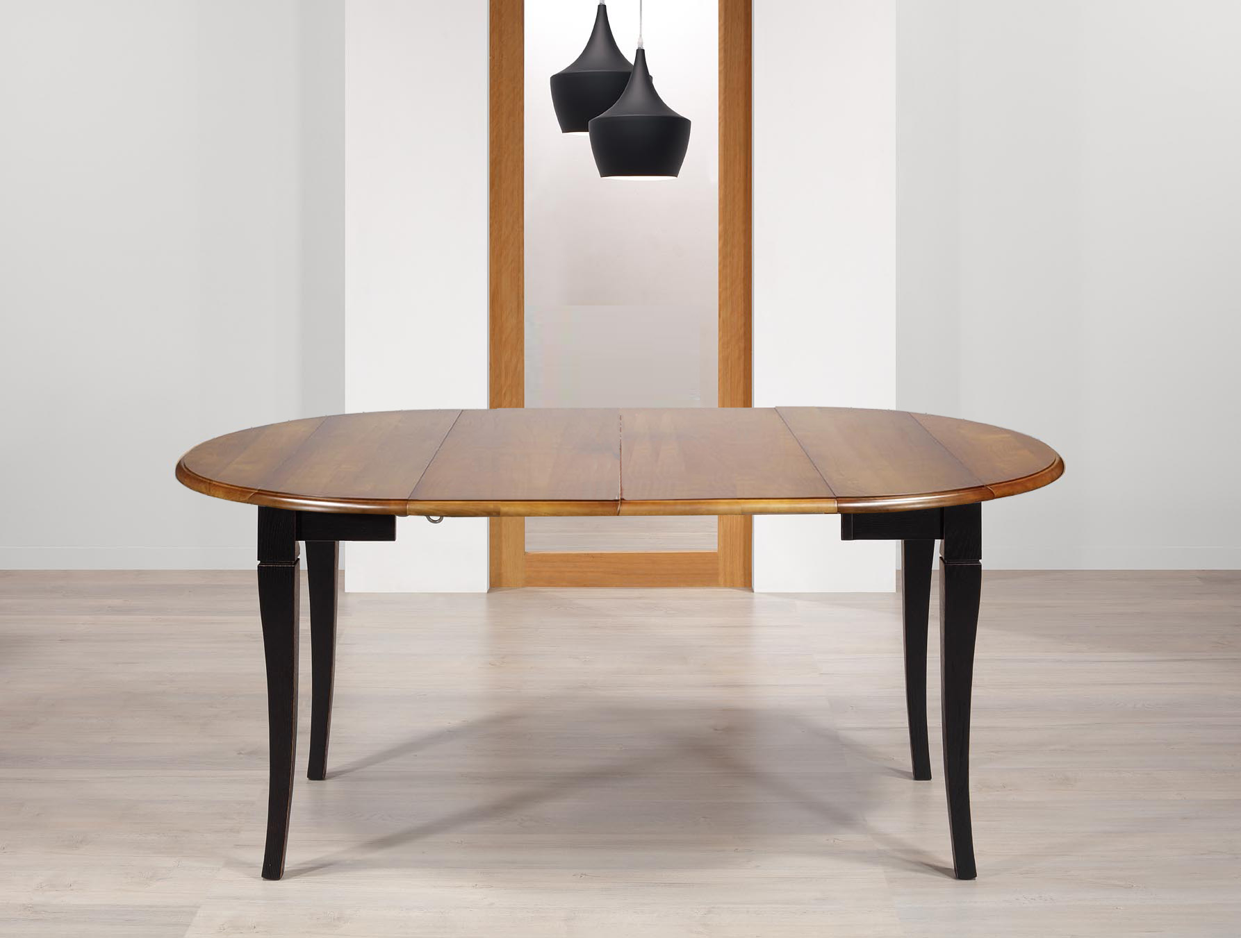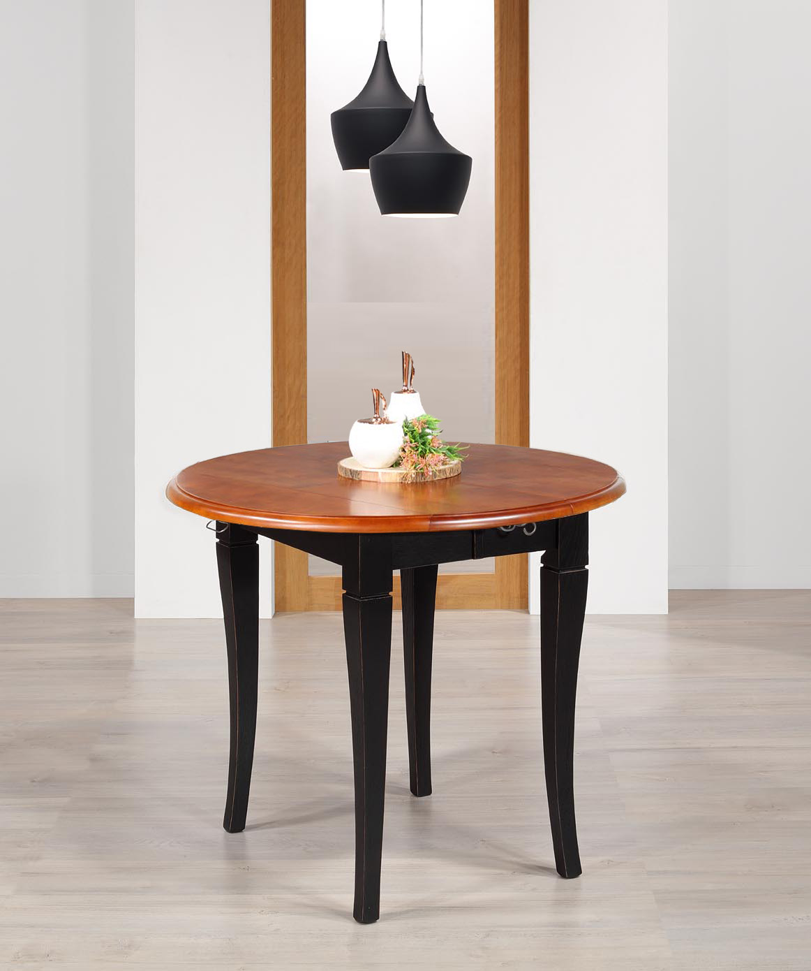 Table ronde à volets 4 pieds sabres Diamètre 90 cm, réalisée en merisier Massif de style Louis Philippe Epaisseur du plateau 28 mm Diamètre 90 cm + 2 allonge* de 40 cm, avec son allonge* cette table mesure 170x90. Sa finition est laqué noir pour les pieds et merisier doré pour le plateau et les allonges*, ou selon votre convenance. Juste un chiffon doux pour l'entretien. N'hésitez pas à demander nos échantillons gratuits
