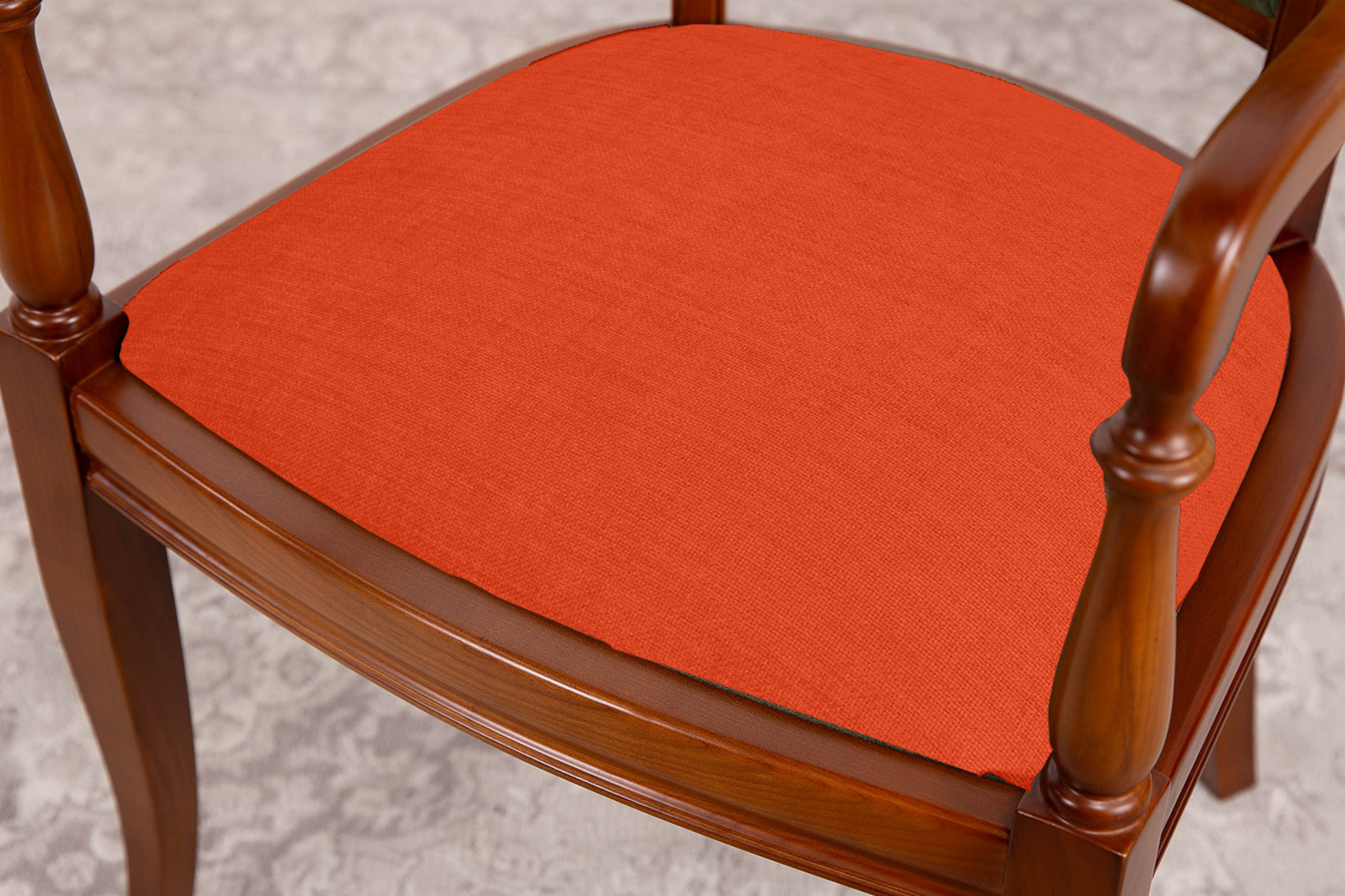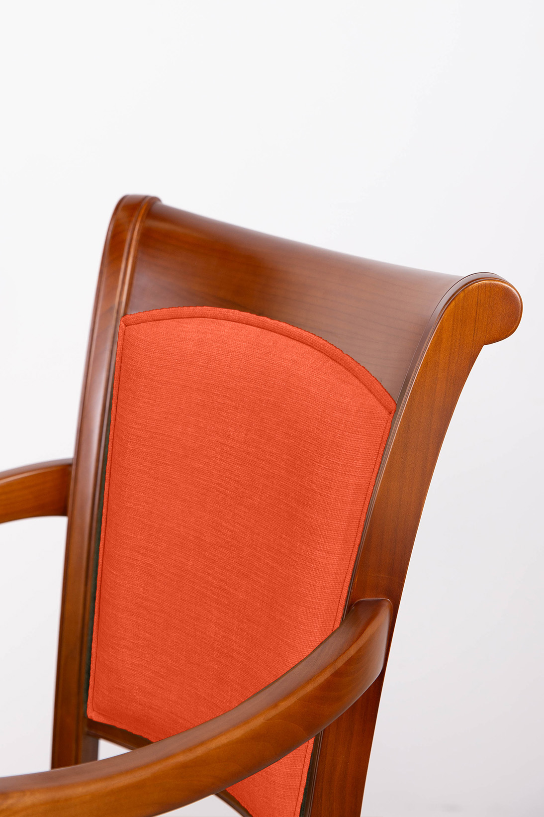 Superbe Fauteuil réalisé en Merisier Massif de style Louis Philippe, Assemblé par tenons mortaises, par tourillons pour le dossier et renforcé par 4 équerres collées vissées. Dossier et assise garnis mousse haute résilience 36kg/m2 Recouvert d'un tissu d'ameublement Bronx Orange. a finition est un merisier teinté noyer clair ciré et lustré ou selon votre convenance. N'hésitez pas à demander nos échantillons gratuits.